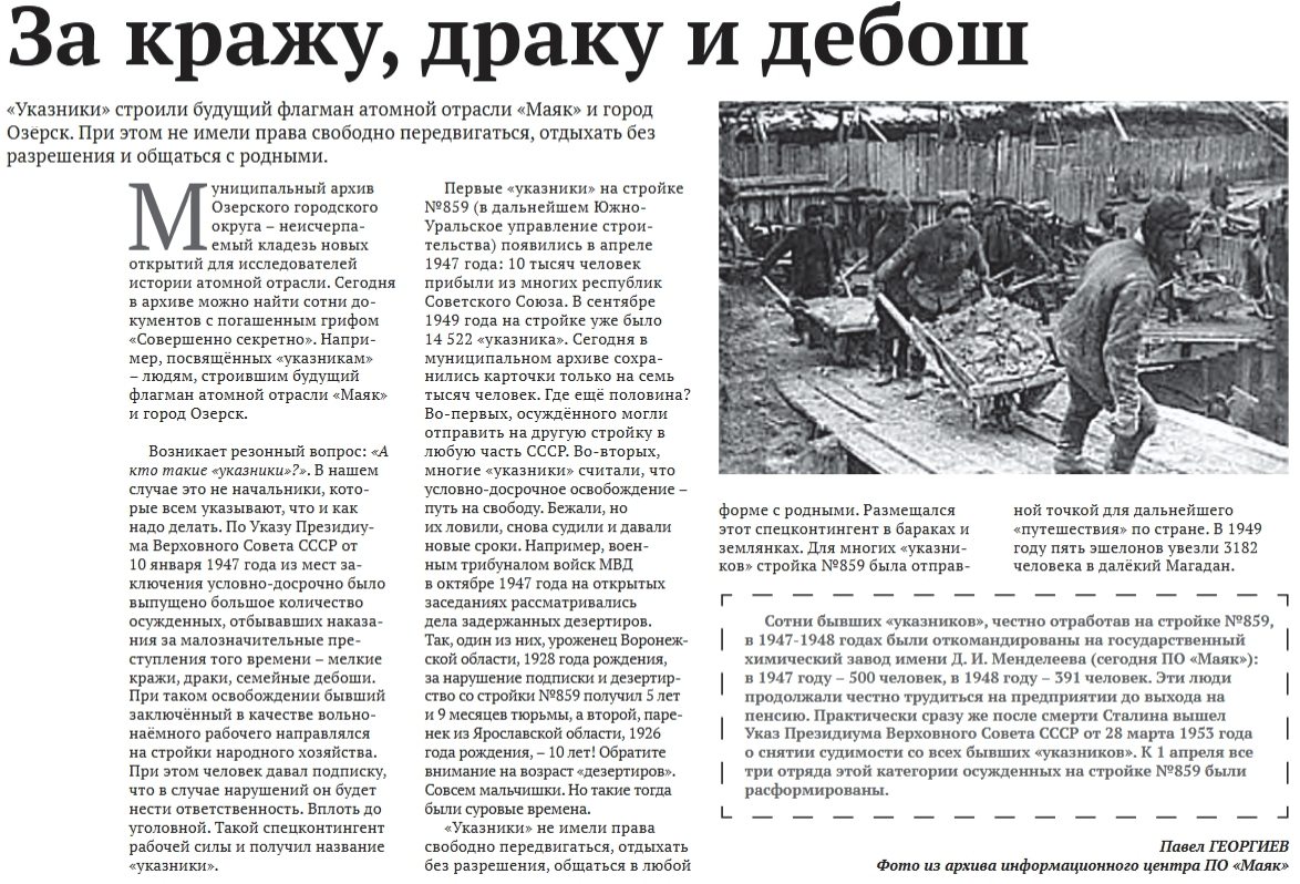 Заметка П.Георгиева в заводской многотиражке "Вестник Маяка" от 04.02.26 частично отвечает на этот вопрос. В строительстве принимали участие так называемые "указники". Это не трудармия, не стройбат.