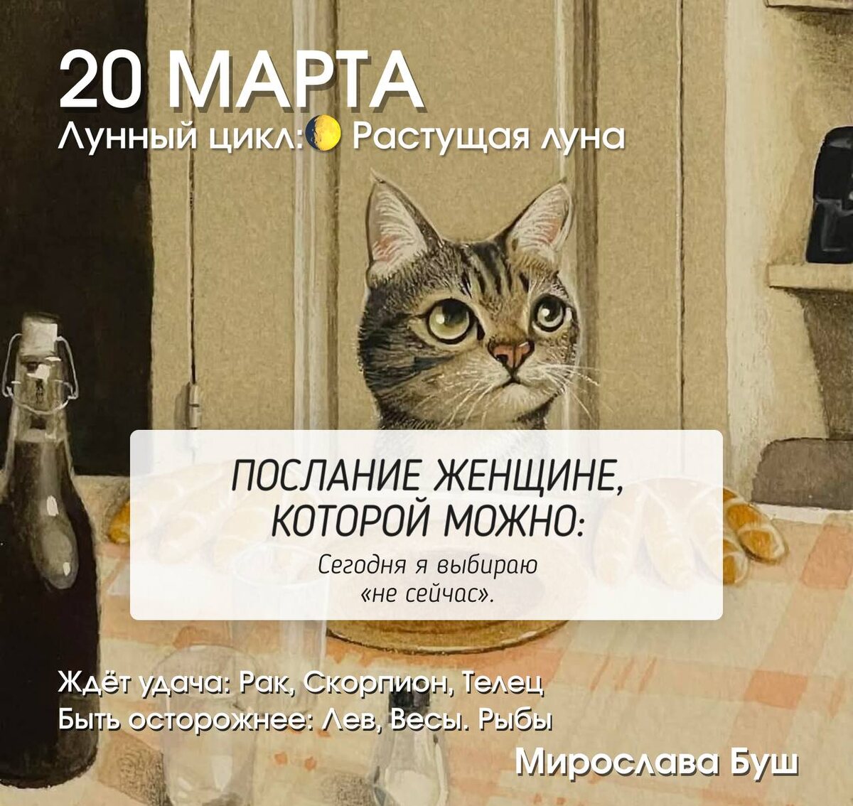 🌸 Сегодня растущая Луна, освещённость примерно 1–3%. Это первый день после Новолуния — энергия только начинает пробуждаться. Всё ещё очень тонко, мягко и нестабильно, но внутри уже появляется лёгкий импульс к движению. ♓️ Луна всё ещё находится в Рыбах (с переходом в Овен ближе к вечеру). Первая половина дня остаётся в водной, чувствительной энергии: интуиция сильнее логики, хочется тишины, уединения и мягкого входа в новый цикл. Но к вечеру включается Овен — и вместе с ним приходит первый настоящий импульс «пора действовать». Это как щелчок: из состояния мечты в состояние движения. ⚡️ Энергия дня переходная: от тишины к импульсу. Не спеши утром, но прислушайся к желанию начать что-то вечером. ‼️ Осторожно… …с резкими стартами «сейчас начну новую жизнь». Несмотря на включение Овна, энергия всё ещё очень хрупкая. Лучше маленькие шаги, чем один перегруз. 💫 Также возможны перепады состояния: утром — спокойствие и размытость, вечером — резкий прилив энергии. Это нормально, просто