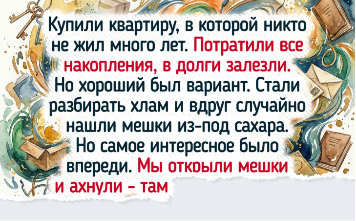- Купили квартиру, в которой никто не жил много лет. Потратили все накопления, в долги залезли. Но хороший был вариант. Стали разбирать хлам и вдруг случайно нашли мешки из-под сахара. Но самое интересное было впереди. Мы открыли мешки и ахнули — там целые пачки купюр номиналом в 5, 10 и 20 долларов выпуска 1990-х годов. Всего 14750 долларов. Как их не нашли раньше — загадка. Но зато теперь есть, чем расплатиться с кредиторами.