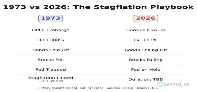 В 1973-м ОПЕК перекрыл нефть – цены на нее взлетели на 300%, акции рухнули, ФРС оказалась в ловушке. Итог – стагфляция на 10 лет. Рисковые активы снижались не всё десятилетие. После шока 1973-1974 гг. акции отскочили на 70% – рынок решил, что худшее позади, но в 1979 году пришел второй шок, и все повторилось. Единственное, что работало на всем горизонте – Золото (х20 за 7 лет), именно в моменты паники. Сегодня: угроза Ормузскому проливу, нефть продолжает дорожать, облигации распродают, фондовый рынок снижается, ФРС стоит на паузе. Сценарий почти зеркальный. ❗️BTC пока торгуется как рисковый актив – снижается вместе с акциями. Но если нарратив «цифровое золото» наконец получит макро-подтверждение – возможен «туземун» как в 70-е года с Золотом. Crypto Headlines