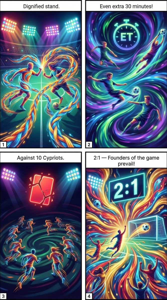 Но всё-таки родоначальники игры превозмогли - на 10-й минуте "овертайма", уже против десятерых киприотов - 2:1 в пользу лондонцев.