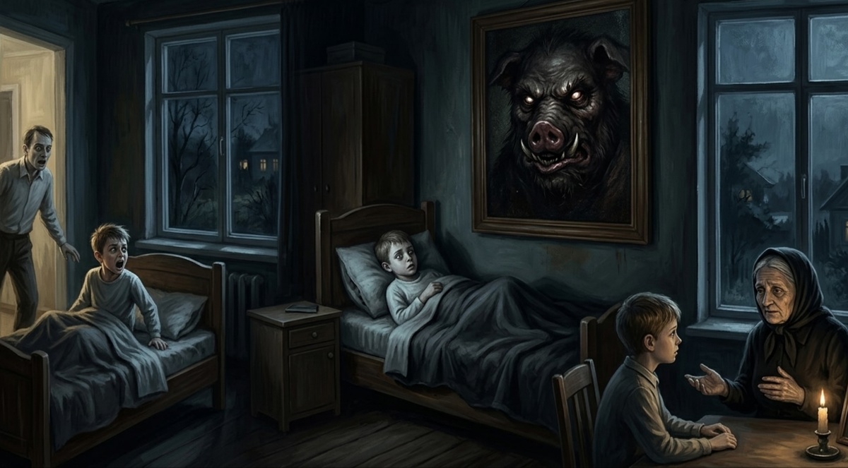На полотне было изображено нечто жуткое — существо, отдалённо напоминающее человека, но с явными свиными чертами. Маленькие глаза картины словно сверлили меня взглядом — даже в темноте я отчётливо это чувствовал. От неприятного ощущения я поспешил отвернуться к стене и вскоре заснул.