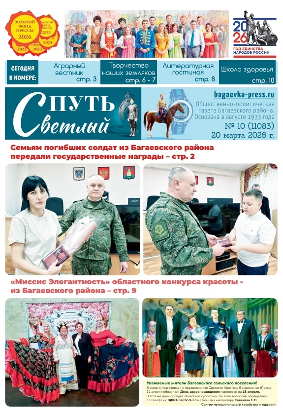 Свет православия. ПАМЯТЬ СОРОКА СЕВАСТИЙСКИХ МУЧЕНИКОВ — стр. 2 Семьям погибших солдат из Багаевского района передали государственные награды — стр. 2 МИХАИЛ СИДЯКИН: «Только вперёд» — стр. 3 В Ёлкинском Центре помощи детям открылась музейная экспозиция, посвященная землякам — участникам СВО — стр. 6 ТВОРЧЕСТВО НАШИХ ЗЕМЛЯКОВ. Представляем работы выпускника Багаевской школы №2 Михаила Шевцова. В первом рассказе он размышляет о творчестве Шолохова. Второй очерк посвящен судьбе еврейского мальчика в годы Великой Отечественной войны, которого, как оказалось, спас брат прадеда автора — стр. 6-7 В Багаевской школе №1 отметили День православной книги — стр. 8 Подведены итоги конкурса «Маленькая принцесса Багаевского района-2026» — стр. 9 Начальник регионального штаба «ЮНАРМИИ» в гостях в Багаевском районе — стр. 9 В Багаевском районе прошла встреча клуба молодых предпринимателей «Действуй» — стр. 9 «Миссис Элегантность» областного конкурса красоты — из Багаевского района — стр. 9 В Багаевско