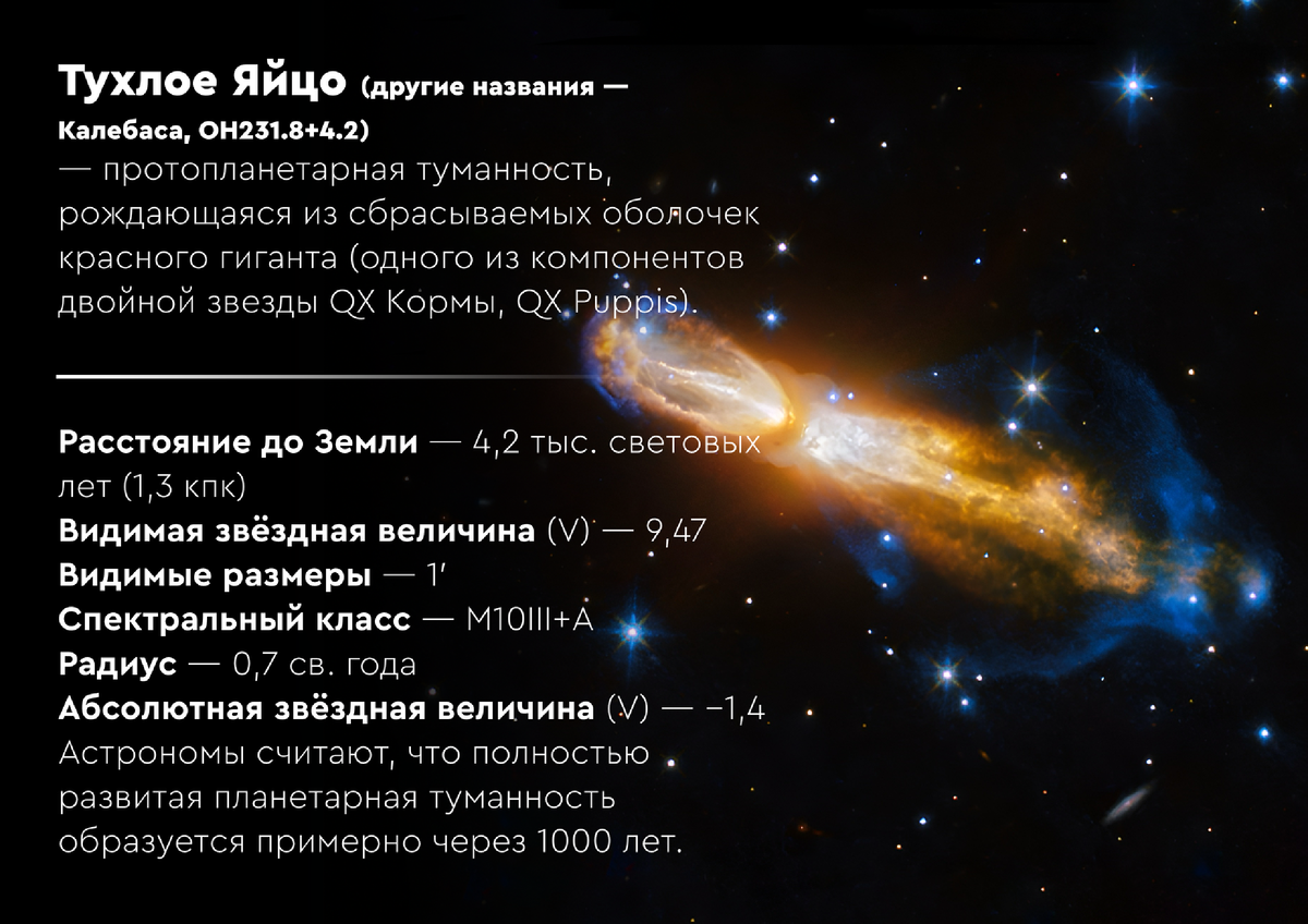 Туманность «Тухлое Яйцо» находится на уникальной стадии эволюции — протопланетарной. Это не планета и не будущая планета. Термин исторический: когда первые наблюдатели смотрели в слабые телескопы, круглые туманности напоминали им диски планет. На самом деле, это финальная стадия жизни звезды средней массы.