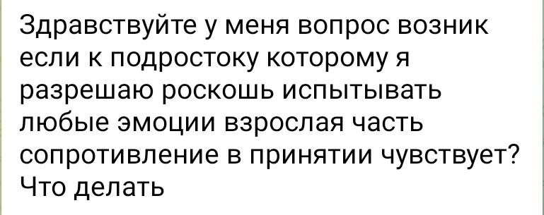 классическая семейная драма, где никто не понимает друг друга. Давайте разберём, кто есть кто в вашей внутренней системе. Только честно и без самобичевания. 🔴 Кто такой этот «подросток»? Это ваш внутренний Ребёнок. Та самая часть, которая чувствует всё остро: восторг, ярость, обиду, страсть. Он хочет жить, ошибаться, пробовать, бунтовать. Разрешать ему чувствовать — это правильно. Это даёт ему жизнь. Но проблема в том, что он не умеет тормозить. Ему всё равно на последствия. 🔴 А кто эта «взрослая часть», которая сопротивляется? Это не взрослая. Это Критикующий Родитель. Тот самый внутренний голос, который когда-то говорил: «Не реви», «Что подумают люди», «Будь удобной». Он не защищает — он контролирует через страх и стыд. И когда подросток оживает, Родитель впадает в панику: «Он всё испортит! Нас отвергнут! Накажут!». ❗️Их конфликт — это война, где вы — поле боя. 🟢 Где же настоящая Взрослая часть? Она сидит здесь и сейчас и задаёт этот вопрос. Именно она осознаёт: «Во мне пр