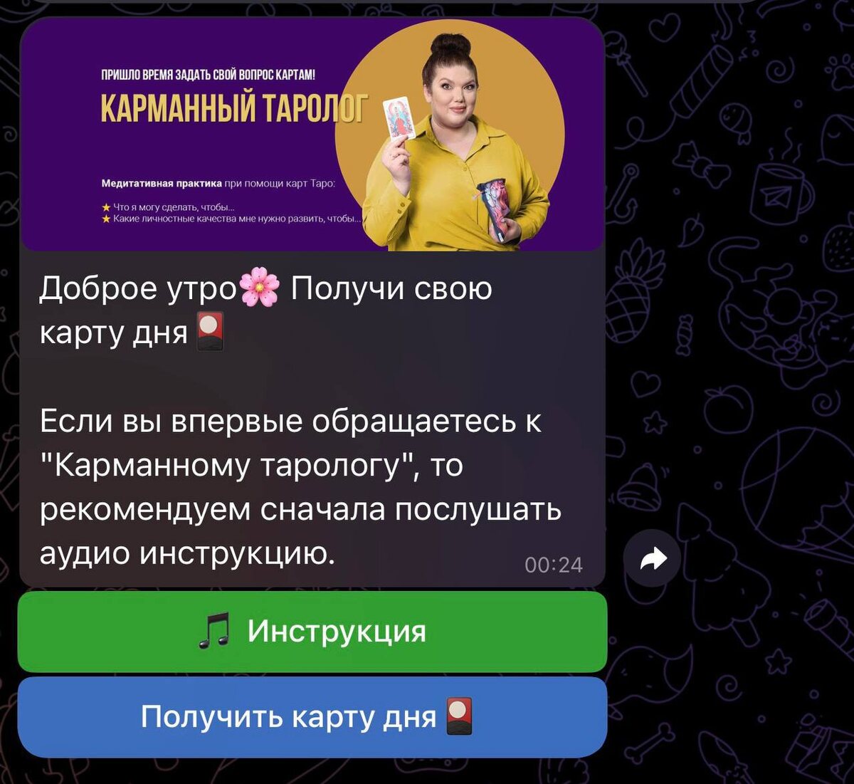 , чтобы день сложился чуть яснее. Иногда мы чувствуем: что-то происходит… но не можем понять в какую сторону двигаться. Поэтому я сделала для вас Карманного таролога — бота, который даёт быструю подсказку на день. 🔮 В боте можно: 🎴 Вытащить карту дня 💬 Задать свой вопрос картам Иногда один символ говорит больше, чем длинные объяснения. Если вы впервые в боте, рекомендую сначала посмотреть короткую инструкцию. 👇 Получить свою карту дня https://t.me/KarelinaTaroBot А когда получите карту — поставьте реакцию под этим постом, интересно посмотреть, сколько из вас сегодня вытянет свою подсказку ✨