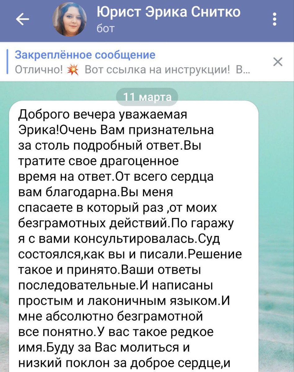 На днях пришло такое сообщение. Человек обратился с вопросом по оформлению гаража. Я расписала как это сделать правильно и без рисков. Человек пошел в суд, сделал все, как было сказано, и... решение принято в его пользу. Это и есть тот самый момент Когда совет вдруг становится отправной точкой, которая реально меняет ситуацию. Человек не просто проконсультировался и забыл, а взял и сделал. И получил результат. Когда есть запрос, доверие и желание разобраться, даже короткая подсказка может привести к победе в суде. И, конечно, такие слова греют душу юристу. Читать их - огромная радость. Здорово, что вовремя сказанные вещи помогают людям выигрывать дела! Если и Вы хотите сказать спасибо за разбор или просто поддержать канал, под каждым постом есть кнопка 👉 Поблагодарить юриста. Для меня это сигнал, что мои советы и правда нужны и работают. 〰〰〰〰〰〰〰〰 ⚖️ Обратиться за консультацией или услугами ⚖️ Задать вопрос юристу бесплатно ⚖️ Получить бесплатные материалы ⚖️ Навигация по каналу ⚖️