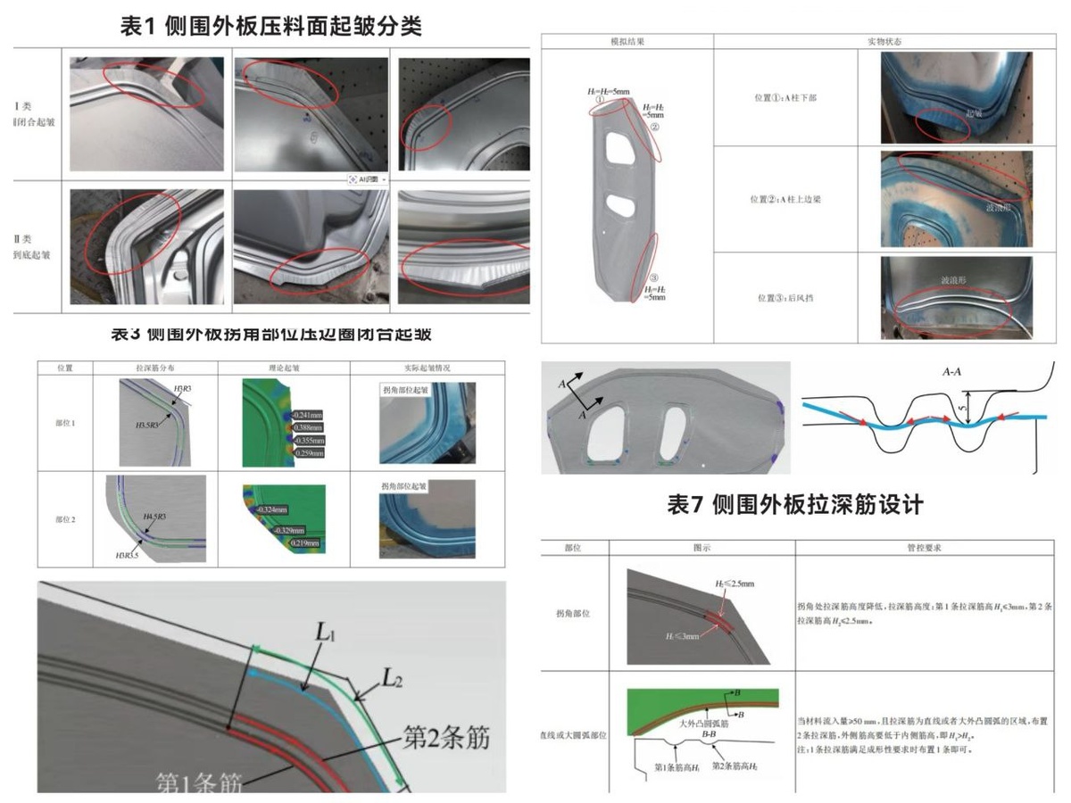 «Инструментальная промышленность» от 28.02.2026). Китайцы продолжают удивлять: в новейшей статье, обобщающей опыт подразделения технологии штамповки Xiaomi в производстве и запуске штампов боковин, они подробно и скрупулезно разбирают тему образования гофр/складок на переходе с вытяжки, и связанных с этим трудностей, и дают рекомендации по их решению, которые нельзя игнорировать. «При компьютерном моделировании процесса вытяжки образование гофр для зоны двустороннего контакта может быть детектировано с помощью измерения высоты дефекта, с допустимым (разрешенным) диапазоном от -0,5 мм до +0,5 мм. Высоты и глубины гофр, превышающие эти значения, считаются существенными отклонениями. Софт для симуляций предсказывает и позволяет решить потенциальные проблемы во время разработки технологии, чтобы минимизировать работы при наладке штампов. Однако результаты компьютерного моделирования часто не полностью совпадают с актуальным положением вещей. Поэтому необходимо анализировать факторы, вли