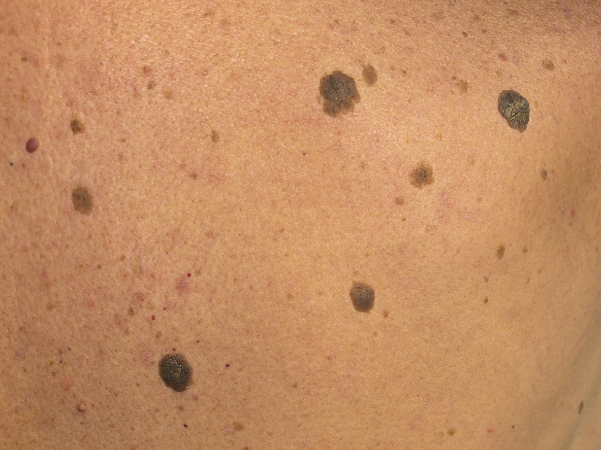 Если на спине или груди за короткий срок (один-три месяца) появилось множество темных, «шершавых» бородавок.