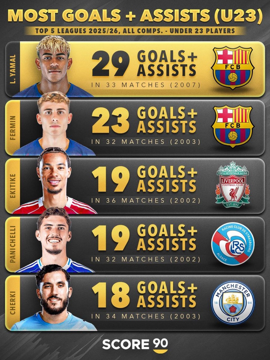 Ламин Ямаль возглавил рейтинг лучших молодых футболистов до 23 лет по системе гол+пас