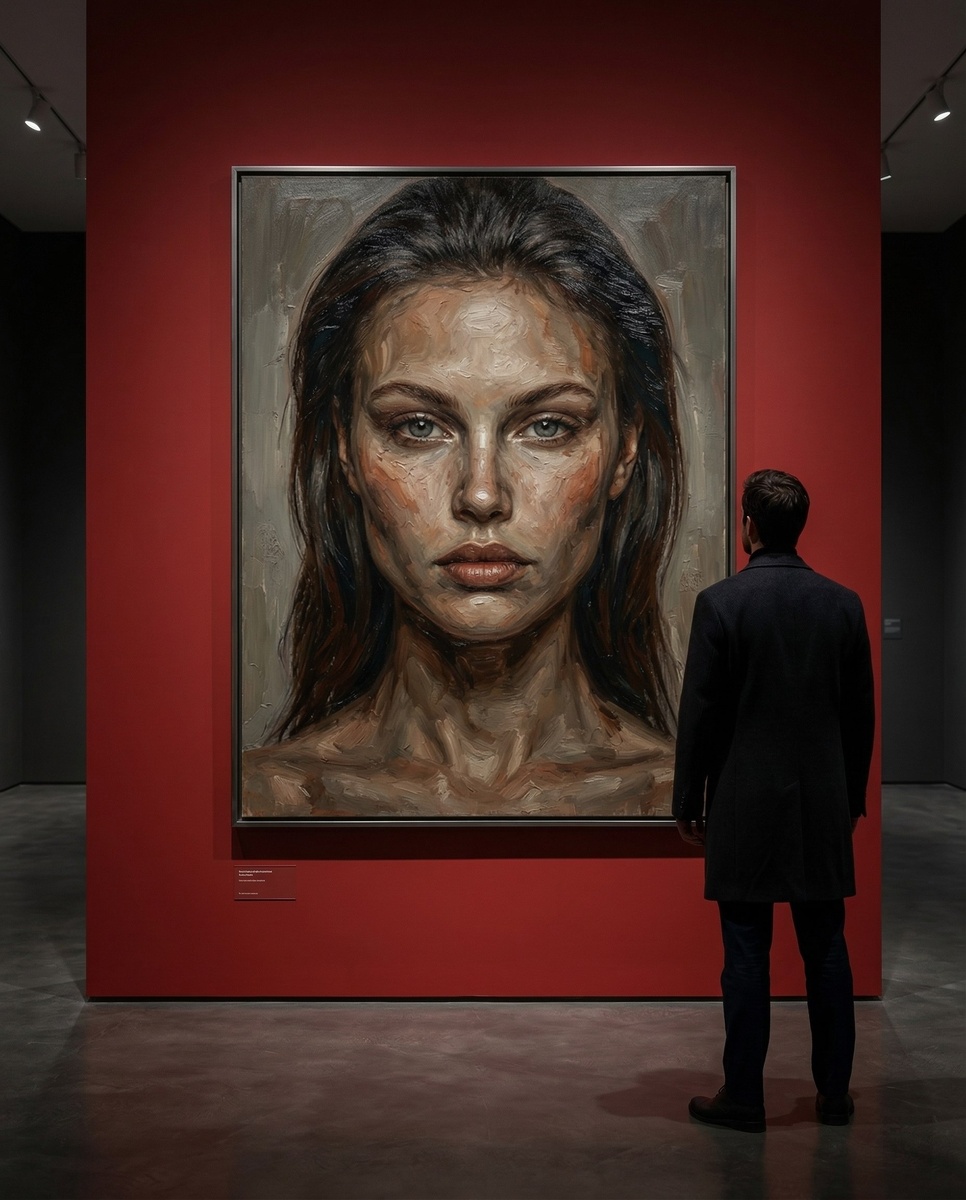 1. Создай сцену в галерее современного искусства, используя прилагаемое изображение лица и внешности девушки, не меняя её черты лица. На стене висит большой портрет девушки маслом. Ее лицо и верхняя часть тела написаны в реалистичной, экспрессивной манере масляной живописи с текстурированными мазками и самой приглушёнными цветами. Чистая красная стена галереи создаёт профессиональную атмосферу выставки благодаря мягкому освещению, освещающему произведение искусства. Перед картиной справа видом сзади, стоит мужчина рассматривая картину, что придает сцене кинематографическое и таинственное настроение.