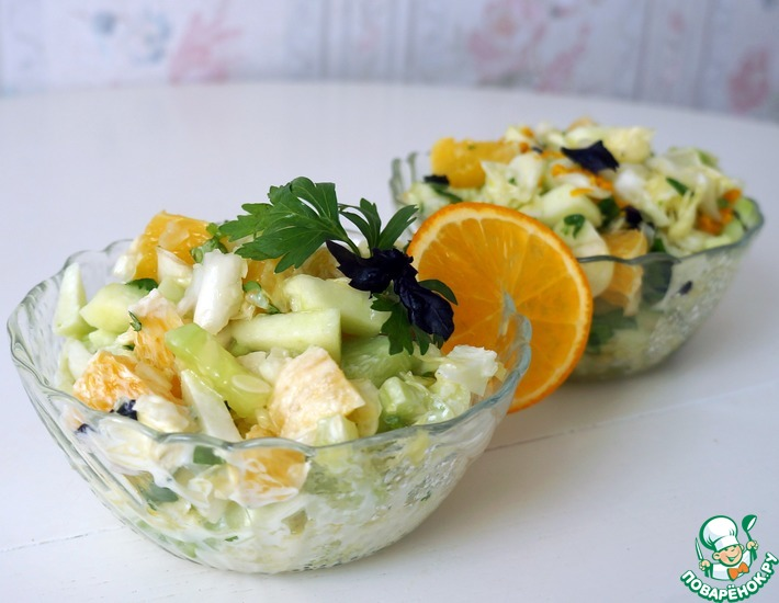 Салат из молодой капусты с апельсинами Этот свежий и яркий салат покорит даже тех, кто не любит капусту. Ингредиенты (на 4 порции): Приготовление: Приятного аппетита!