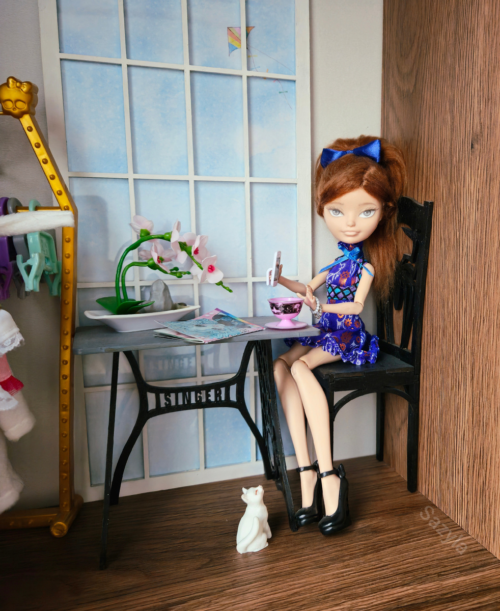 Но даже так она всегда на моем столе. Это единственная кукла в моей коллекции, кто имеет собственную жилплощадь и даже мебель. К ней, конечно, периодически залетают поселенцы, но выгнать пока никто не смог.