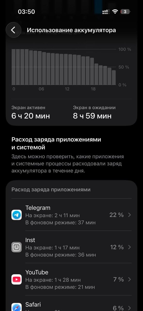 ⚡️Автономность iOS 26.4 RC Снял с зарядки в 23:05 и активно пользовался до 06:00 утра, а потом с 15:00. В итоге в 03:49 остается 3%. По условиям все стандартно для меня: LTE на двух симках, вайфай/сотовая сеть 50/50 по времени. Яркость 50%. Как обычно соцсети, браузер, ютуб, навигация. Айфон 17 Про, емкость аккума 100%. Always On и 120гц включены. В итоге более 10 часов экрана. Подтянули в сравнении с бетами, для меня это хороший результат. Как у вас?🤔