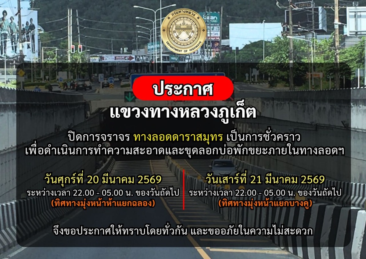 Тоннель у торгового центра Central Phuket будет закрыт для движения транспорта в течение двух ночей подряд – с 20 на 21 марта и с 21 на 22 марта. Уведомление об этом выпустил пхукетский офис Департамента скоростных магистралей (DOH Phuket). Как пояснила пресс-служба ведомства, на ближайшие две ночи запланирована большая уборка 📍тоннеля Darasamut Underpass, включая чистку резервуара, в который собираются сточные воды. 🔻 В пятницу, 20 марта, с 23:00 вечера до 5:00 утра будет закрыта полоса для движения в сторону Чалонга. 🔻 В субботу, 21 марта, с 22:00 вечера до 5:00 утра будет закрыта полоса для движения в сторону Ко-Кэу. Движение по наземным полосам на перекрестке Darasamut Intersection ограничиваться не будет. Департамент скоростных магистралей принес извинения за возможные неудобства. Запрет на движение большегрузов с 6:00 до 21:00 Также на этой неделе полиция Вичита выпустила напоминание о том, что тоннель у Central Phuket теперь закрыт для всего тяжелого транспорта (автобус