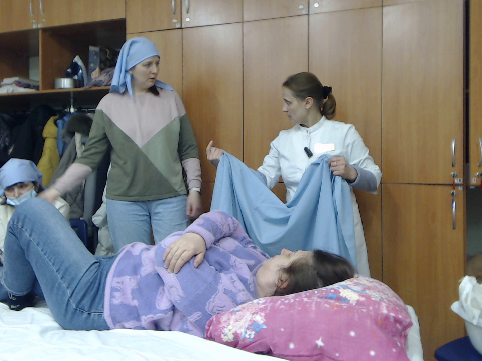 Прошло два месяца, как группа по специальности «Младшая сестра милосердия» юбилейного десятого набора приступила к обучению. Сейчас братья и сестры изучают основы ухода за больным. Они уже умеют правильно пересадить подопечного, знают положения Фаулера и Симса, смогут совершить гигиенический уход. Группа выбрала старосту – Татьяну Александровну. Она рассказала о первых месяцах обучения: «О курсах я узнала случайно. Но мы знаем, что случайностей не бывает. Как-то так сложилось, что мне в жизни приходилось очень много помогать больным родственникам, в том числе и проводить некоторые медицинские манипуляции (перевязки, уколы) А вот осуществлять уход за лежачими больными мне приходилось опять же только в части медицинских манипуляций. Как ухаживать, что делать, чтобы ему не навредить, помочь, я не знала. И вот я на курсах. С самой первой молитвы понимаешь, что все гораздо глубже, чем ты ожидал. Я думала, что будет просто обучение уходовым манипуляциям. Но в результате обучения происходи