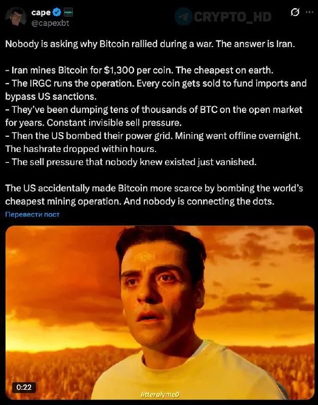Анализ последствий атаки США на Иран для курса Биткоина и рынка криптовалют. Среди ключевых решений и фактов: США уничтожили энергетическую инфраструктуру Ирана, что парализовало крупнейшую теневую майнинговую операцию в стране; Иран добывал Биткоин по рекордно низкой цене — около $1300 за монету, что делало его одним из самых дешёвых майнеров в мире; Устранение иранских майнеров сократило невидимое давление на рынок, так как они продавали добытые BTC для обхода санкций; Эксперты… Читать полностью