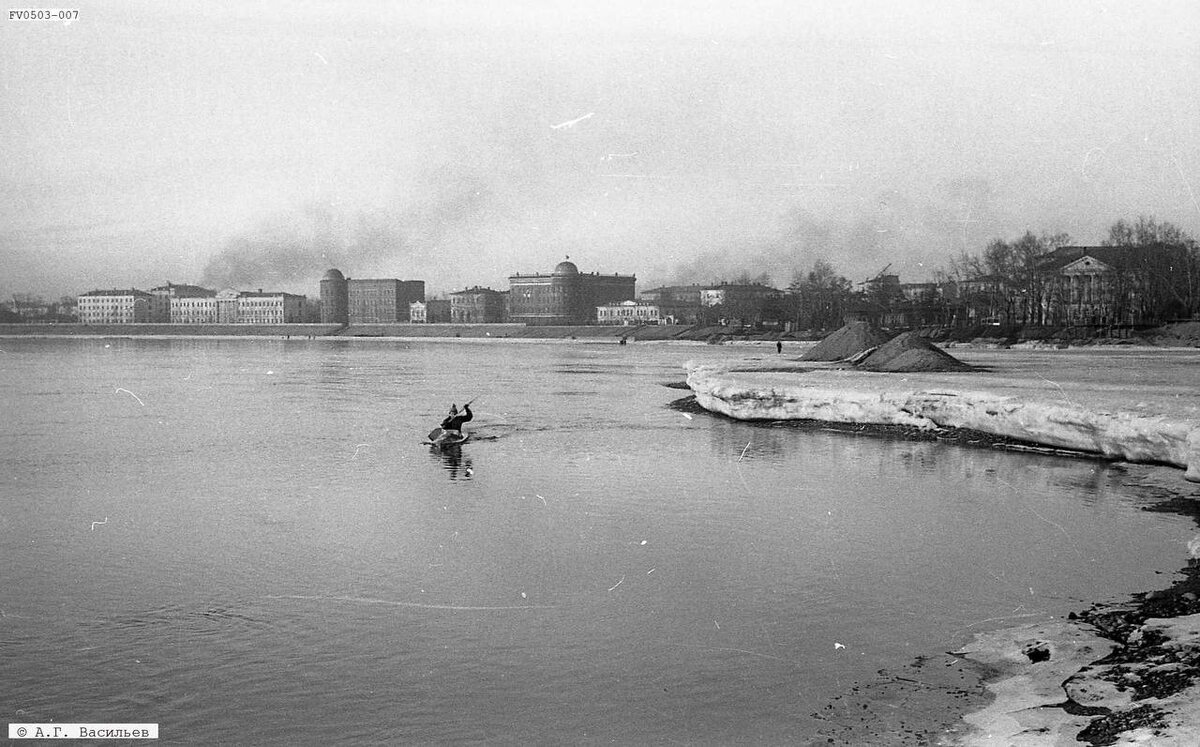 ! Взгляните на вид Вузовской набережной, переименованной в будущем в бульвар Гагарина. Справа за деревьями виднеется Белый дом, чуть поодаль стоит здание бывшей канцелярии генерал-губернатора. Иргиредмет еще не представляет собой единого здания, это произойдет позднее. Слева от него стоит белое здание с треугольным фронтоном – это так называемый Кооперативный техникум. © Использованы фотографии из ЭКБ «Хроники Приангарья»: Васильев, А. Г. Иркутские гребцы вышли на воду. 20 марта 1961.