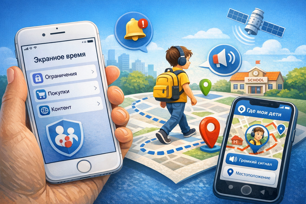 Родительский контроль на айфон лучше настраивать в два слоя. Первый слой даёт сам iPhone: через «Экранное время» можно задать ограничения для покупок, веб-контента, встроенных приложений и других параметров устройства ребёнка. Второй слой закрывает приложение «Где мои дети»: оно помогает контролировать использование приложений, видеть где сейчас ребёнок, смотреть историю передвижений, получать уведомления о перемещениях и отправлять громкий сигнал, если телефон на беззвучном режиме. Для родителей подростков это удобная схема. Вы не пытаетесь решить одной кнопкой сразу всё, а собираете понятную систему: на iPhone ограничиваете лишнее, через приложение «Где мои дети» видите на что он тратит время и остаётесь в курсе дороги из школы, секций и обычных перемещений по городу. Что можно настроить на iPhone У Apple за родительский контроль отвечает «Экранное время». С его помощью можно поставить код-пароль на настройки, ограничить покупки в App Store и встроенные покупки, скрыть часть встроенн