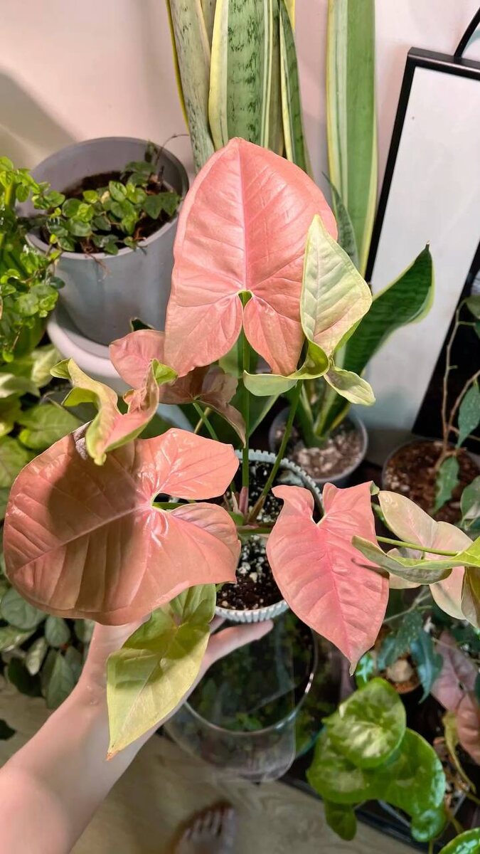 сингониум неон робуста нежно-розовые листья, со временем могут зеленеть уход: 💚свет: яркий рассеянный, без него розовый уходит 💚полив: умеренный, после подсыхания верхнего слоя 💚грунт лёгкий: универсальный + перлит филодендрон пинк принцесс тёмные листья с яркими розовыми пятнами, очень контрастный уход: 💚свет: яркий рассеянный, иначе розовые сектора исчезают 💚полив: умеренный, не любит переувлажнение 💚грунт воздушный: грунт + перлит + кора фиттония розовая маленькая, но очень яркая, с розовыми прожилками уход: 💚свет: мягкий рассеянный 💚полив: регулярный, не пересушивать (быстро вянет) 💚грунт: лёгкий и влагоёмкий строманта триостар эффектные листья: зелёный, кремовый и розовый уход: 💚свет: яркий рассеянный 💚полив: стабильный, без пересушек и переливов 💚влажность: высокая, иначе сохнут края 💚грунт: воздушный, с корой и перлитом каладиум почти полностью розовые листья, выглядит как искусственный уход: 💚свет: яркий, но без прямого солнца 💚полив: в период роста регу