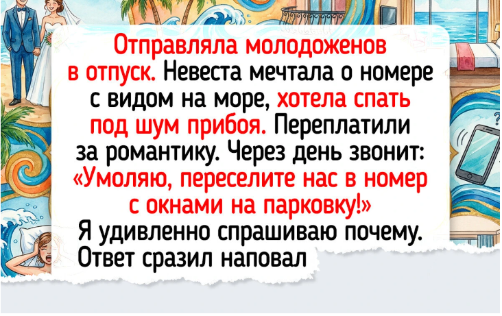 - Отправляла молодоженов в отпуск. Невеста мечтала о номере с видом на море, хотела спать под шум прибоя. Переплатили за романтику. Через день звонит: «Умоляю, переселите нас в номер с окнами на парковку!» Я удивленно спрашиваю почему. Ответ сразил наповал: «Оказалось, что море — это очень громко. Оно плещется всю ночь, как будто у нас в ванной трубу прорвало. Мы уже две ночи с закрытым балконом и в берушах спим, никакой романтики, одна бессонница».