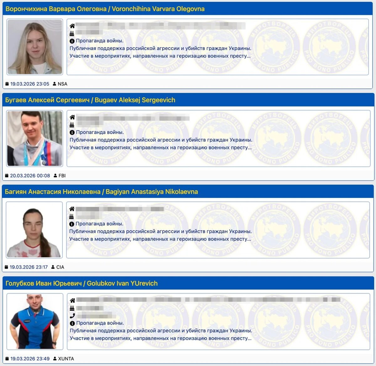 Горнолыжников Варвару Ворончихину и Алексея Бугаева, а также лыжников Анастасию Багиян и Ивана Голубкова — добавили в базу экстремистского сайта «Миротворец». Их обвиняют в «покушении на территориальную целостность Украины» и «поддержке агрессии» — за то, что они участвовали в соревнованиях под российским флагом и с российским гимном.