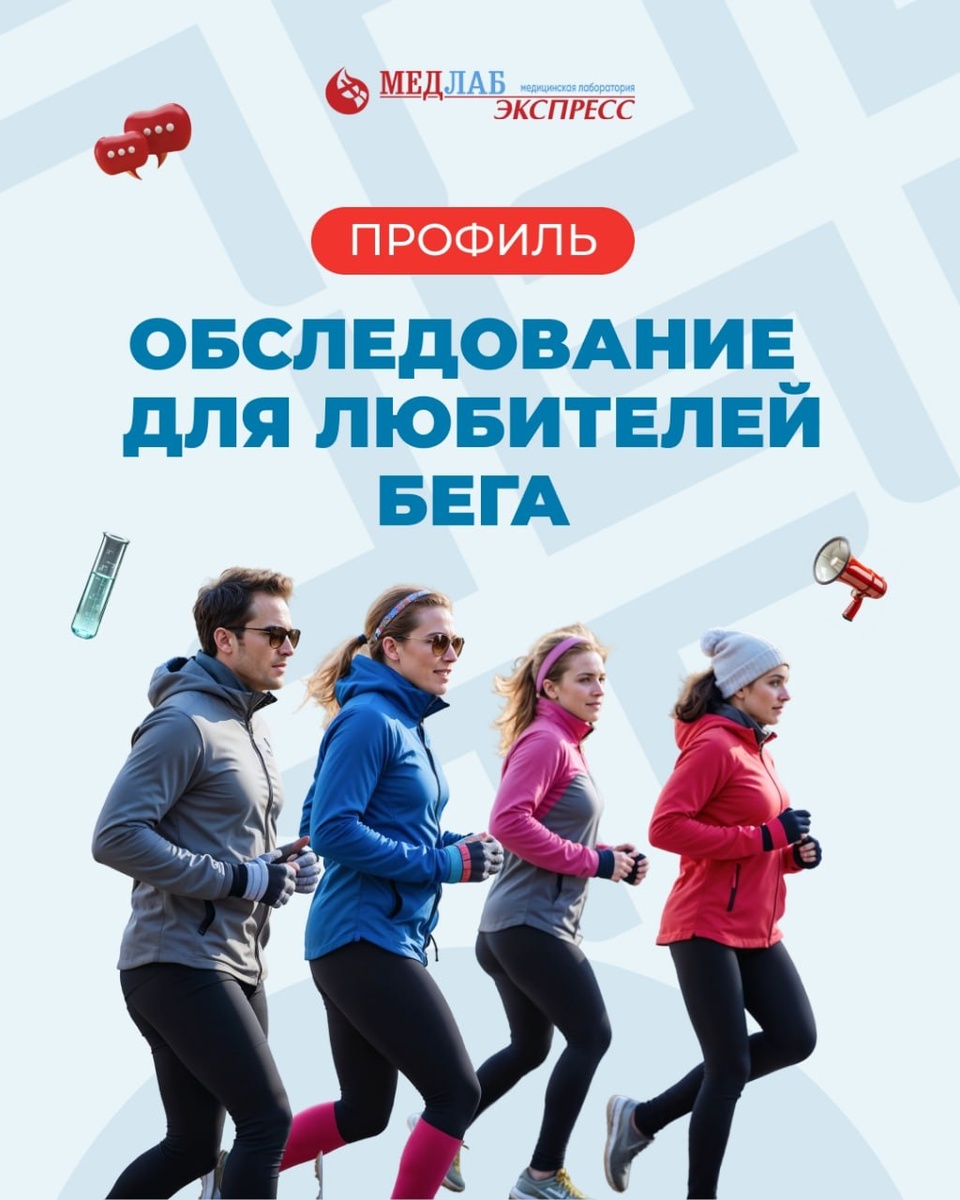 ! С приходом теплых дней и капели за окном многие начинают активно заниматься спортом, в том числе бегать, чтобы привести свое тело в порядок и подготовиться к предстоящим забегам на длинные легкоатлетические дистанции. В нашей лаборатории есть комплексный профиль «Обследование для любителей бега», который помогает убедиться, что организм готов к предстоящим нагрузкам. В него входят: 📍06.06 Глюкоза 📍06.15 АЛТ 📍06.16 АСТ 📍06.25 Холестерин общий 📍06.26 ЛПВП 📍06.27 ЛПНП количественно 📍08.01 Общий анализ крови 📍10.01.01 Общий анализ мочи авто Не забывайте, что здоровье — это основа успешных тренировок. Желаем быстрых трасс без ветра💙