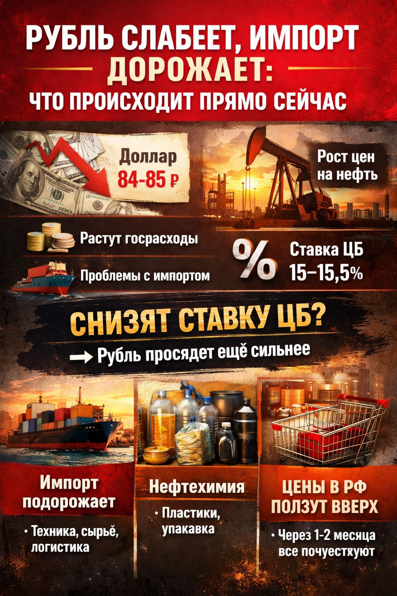 НО = слабее рубль То есть ЦБ оказался в классической ловушке: поддержать экономику - ослабить рубль укрепить рубль -душить бизнес высокой ставкой Что это значит для импорта и бизнеса Импорт будет дорожать курс + логистика = двойной удар особенно по технике, оборудованию, сырью Нефтехимия и производные пластики, упаковка, химия - уже под давлением рост цен на нефть + курс усиливают эффект Цены в РФ будут расти дальше мы ощутим на себе через 1-2 месяца сначала B2B → потом розница Главный вывод Даже если ставку снизят - это не спасет курс, а может наоборот ускорить его