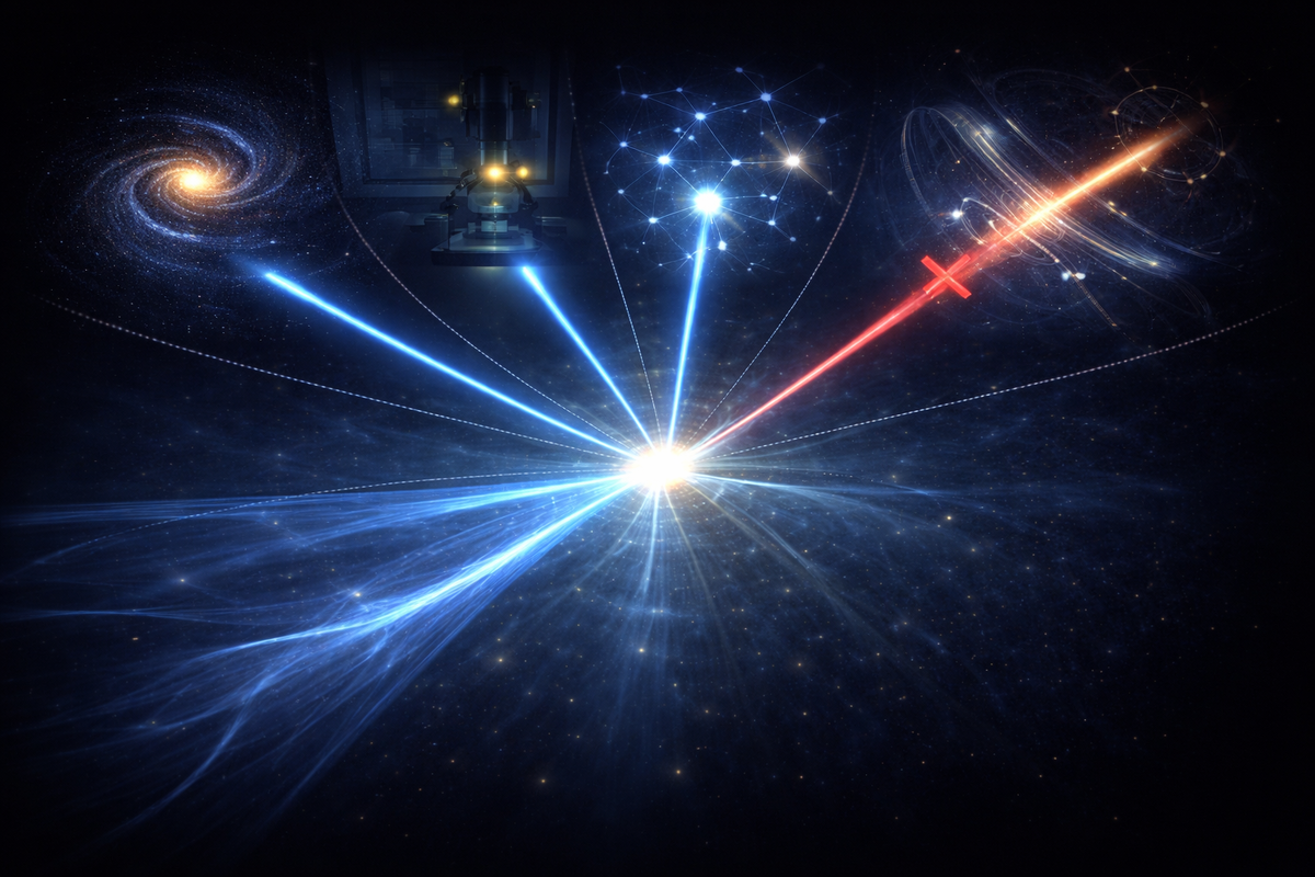 ‒ один масштаб И это выглядит убедительно. Но это ещё не проверка. Это совпадение. Потому что почти любую идею можно подогнать под одну задачу. Ситуация меняется, когда одна и та же идея начинает проверяться в разных задачах. Причём не независимо, а через общие параметры. Тогда возникает новая логика. Не “совпадает или нет”, а: совпадает ли всё одновременно? Представим, что одна гипотеза используется сразу в нескольких задачах: ‒ астрофизика