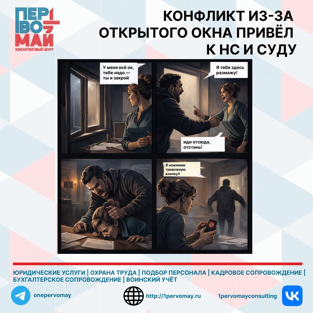 ⚖️ Сотрудница М. открыла окно в коридоре, чтобы проветрить помещение. Соседу А. стало холодно. Он написал в рабочий чат: "Закрой окно, темно дышать!" М. ответила: "У меня всё ок, тебе надо — ты и закрой." ЧТО ПРОИЗОШЛО ДАЛЬШЕ А. в верхней одежде влетел в кабинет М., выражаясь нецензурной бранью: "Что до меня докопались. Я тебя здесь размажу." М. встала: "Иди отсюда, отстань." А. подошёл к ней с бешеными глазами, занёс левую руку, ударил по затылку, схватил за шею и пытался ударить лицом об стол. М. схватила пульт с тревожной кнопкой и крикнула: "Я нажимаю!" А. выбежал из кабинета. ❗️ЧТО ДОЛЖЕН БЫЛ СДЕЛАТЬ РАБОТОДАТЕЛЬ ➡️ Расследовать инцидент как несчастный случай (работник получил травму на рабочем месте в рабочее время) ➡️ Запросить медицинское заключение о степени тяжести травмы ➡️ Создать комиссию по расследованию НС ➡️ Установить, является ли травма производственной или не связанной с производством ➡️ Оформить все необходимые документы согласно порядку расследования несча