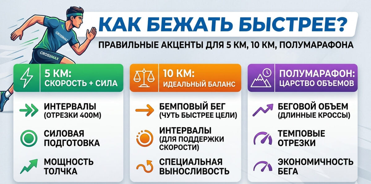 Привет! Это Денис из CROSSMAX. Многие бегуны годами топчутся на месте: объемы растут, а кроссовки быстрее не бегут. Главная ошибка — тренироваться одинаково и для «пятерки», и для полумарафона. Ваш организм — это адаптивная машина и чтобы он выдал результат, нужно правильно крутить настройки скорости, выносливости и силы. Разберемся, на что жать в зависимости от вашей цели. ⚡️ 5 км: Скорость и ноги Пятерка — это коротко и очень больно. Здесь не получится «отсидеться» на низком пульсе. Главный акцент: Интервалы и силовая подготовка. Почему: Дистанция короткая, поэтому на первый план выходит мощность толчка и способность терпеть высокую закисленность. Что делать: Отрезки 400 метров через 400 метров легкого бега. Таких повторов должно быть 8–10. Бежим быстро, почти на пределе, но так, чтобы последний отрезок не был медленнее первого. И не забываем про зал, сильные ноги дают ту самую скорость. ⚡️ 10 км: Идеальный баланс Десятка - тут нужно уметь держать высокую скорость долго. Главный акце