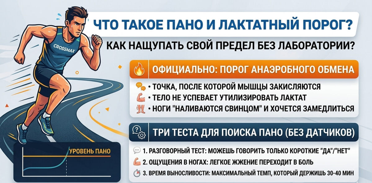 Привет! Это Денис из CROSSMAX Многие бегуны боятся ПАНО как огня или, наоборот, пытаются найти его в цифрах пульсометра, которые часто врут. На самом деле, понимание своего порога — это ваш легальный чит-код к быстрым секундам. Что такое ПАНО на языке мышц❓ Если официально: ПАНО — это порог анаэробного обмена (или лактатный порог), то есть это та точка, после которой ваш организм перестает справляться с «мусором». Представьте: вы бежите, мышцы работают и выделяют молочную кислоту (лактат). Пока темп спокойный, тело успевает её перерабатывать. Но как только вы ускоряетесь выше порога, лактата становится так много, что система «утилизации» захлебывается. Результат: ноги наливаются свинцом, дыхание сбивается, и вы резко замедляетесь. Как нащупать свой порог без похода в лабораторию? Необязательно сдавать кровь из пальца на беговой дорожке, чтобы понять, где ваш предел. Тело само подает сигналы: 🔢 Разговорный тест: Если вы бежите и можете выдавить только короткое «да» или «нет», а полноц