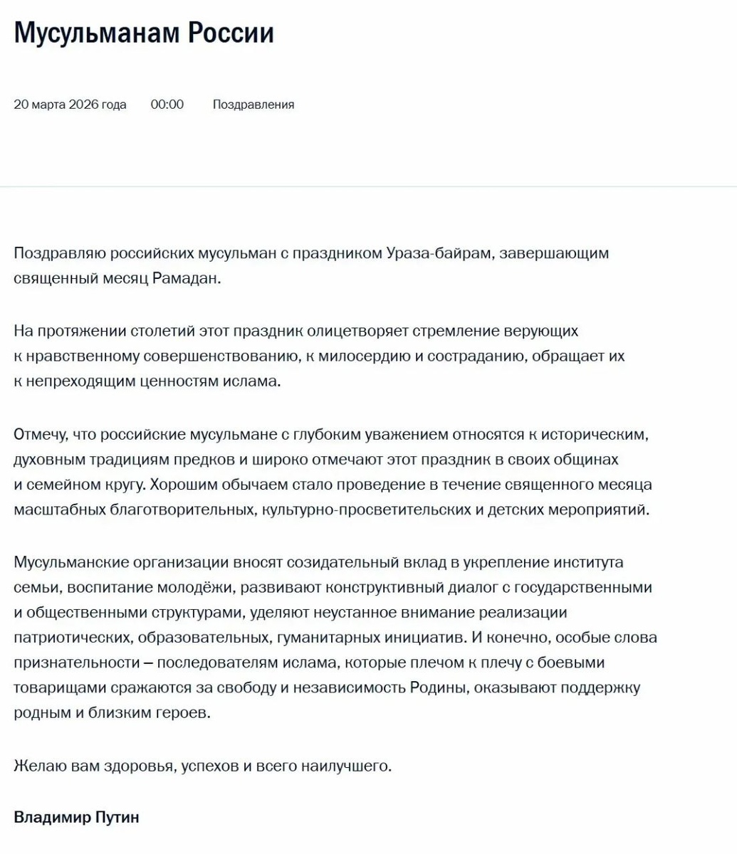 ! Владимир Путин поздравил мусульман России с Ураза-байрамом, отметив роль праздника в укреплении нравственных ценностей и вклад мусульманских организаций в поддержку семьи. https://max.ru/id2372001505_gos https://ok.ru/group/70000041523919 https://vk.com/public212083585 https://dzen.ru/id/660af8bc3bd95d5b99e56429 - подпишись на СВОй "Рассвет".