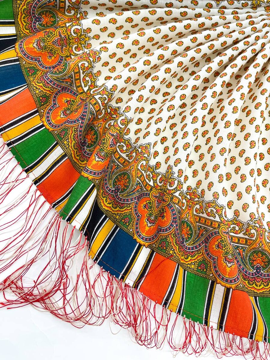 🤍Молочный фон раскрывает восточный орнамент: каждый миниатюрный бут становится более заметным, чётким, почти ювелирным. Рисунок будто дышит, оставляя пространство между мотивами. Этот приём создаёт ощущение лёгкости и благородной чистоты. 🖼️ Кайма по-прежнему остаётся сердцем композиции. Тонкая графичная обводка подчёркивает каждый лепесток, каждый завиток аканта. 💫Полосатая рамка с насыщенными изумрудными, чёрными, лазурными и апельсиновыми полосами работает как декоративный элемент. Она собирает композицию, добавляя динамику и ритм, а бахрома мягко завершает образ, придавая ему движение. 🧥 Такой платок особенно красиво подчеркнёт светлое пальто, бежевый тренч или карамельный жакет. Он освежит лицо, сделает образ мягче и благороднее. —————— Платок шерстяной с подрубкой "Восточная кайма" Арт. 1898-54 Размер: 89x89 см Художник: Шумарина Анна