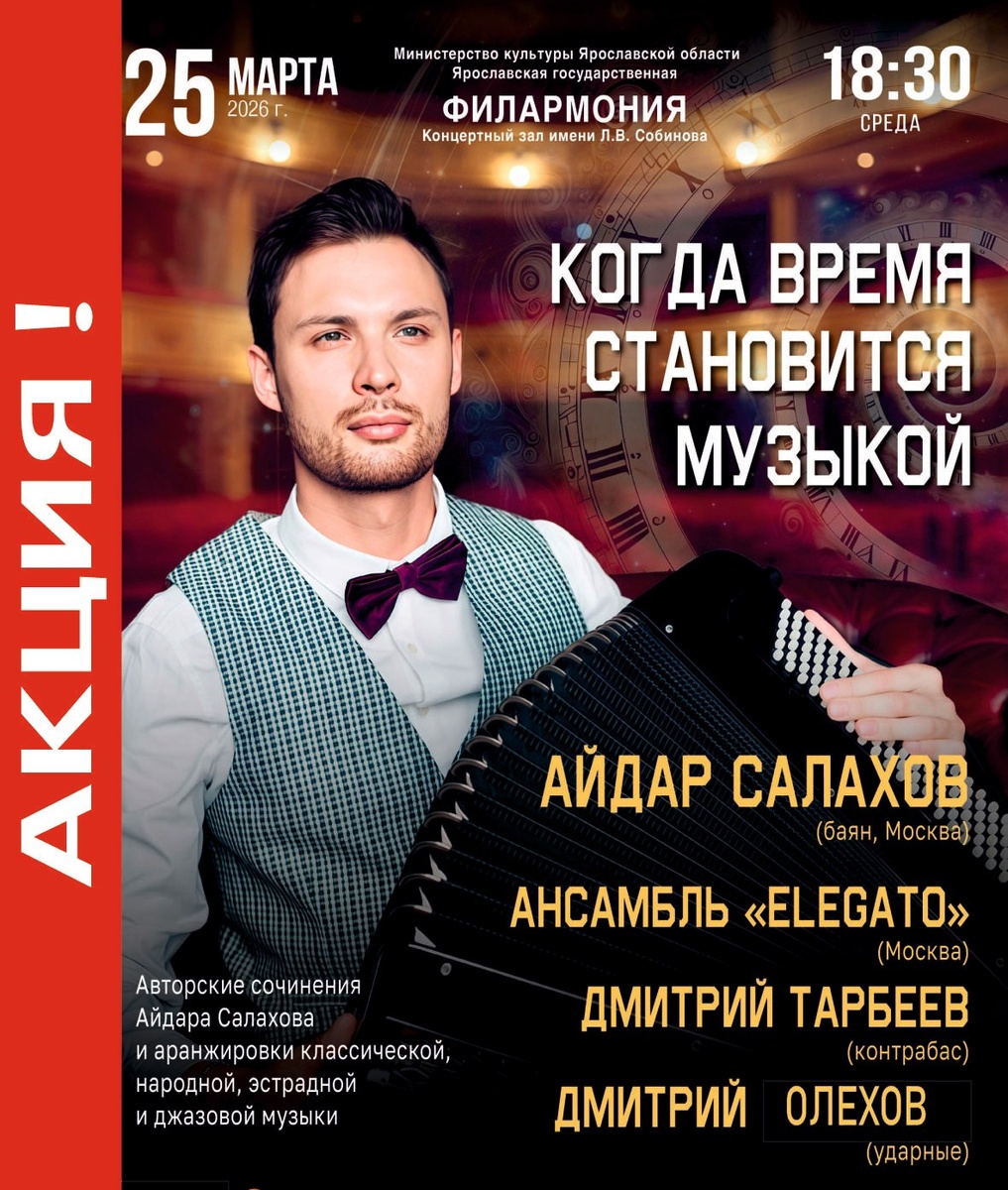 🎶 👏 Айдар Салахов (баян) - музыкант, который заставит вас забыть всё, что вы знали о баяне. Победитель престижнейших мировых конкурсов в Германии и Испании, солист Московской филармонии и автор саундтрека к фильму «Петровы в гриппе». Его игра - это безупречная техника, искренность и мощная энергетика. 👏 Дмитрий Тарбеев (контрабас) - глубокий пульс и бархатный ритм. 👏 Дмитрий Олехов (ударные) - живое сердце и динамика вечера. ❗❗ВНИМАНИЕ! ВЫГОДА 20% ❗ С 17 по 25 марта вы можете приобрести билеты на концерт «Когда время становится музыкой», который состоится 25 марта в 18:30 со скидкой 20%. https://quicktickets.ru/yaroslavl-filarmoniya/s313