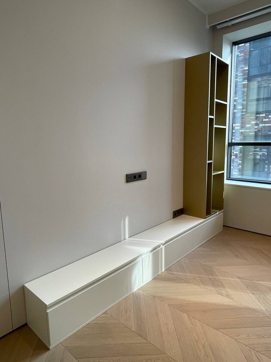 Стеллаж в тв-зоне. Эмаль в цвете металлик. Консоль - белая эмаль с интегрированными ручками.