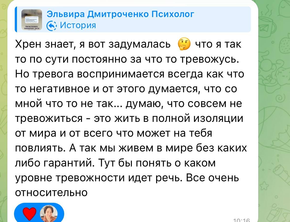 Чуть позже выйдет пост «хорошо или плохо испытывать тревогу» по мнению ведущих психологов, изучавших эту тему 😊