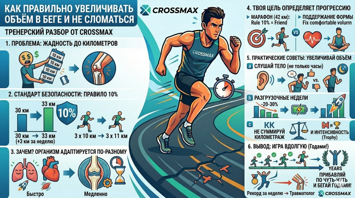 Привет! Это Денис из CROSSMAX Одна из самых частых причин, почему бегуны ломаются и уходят на больничный — это жадность до километров. Сегодня ты чувствуешь себя героем и пробегаешь в два раза больше обычного, а завтра колено или надкостница передают тебе пламенный привет. В беговом мире есть железный стандарт безопасности: не увеличивай недельный объем более чем на 10%. Почему именно 10? Всё просто: ваши мышцы и легкие адаптируются довольно быстро, а вот связки, суставы и кости гораздо медленнее. Им нужно время, чтобы привыкнуть к новой нагрузке. Как это выглядит на цифрах: Допустим, ты бегаешь 3 раза в неделю по 10 км. Твой суммарный объем — 30 км. ✅ На следующей неделе твой безопасный лимит — 33 км. ✅ Проще всего накинуть по одному километру к каждой тренировке и пробежать три раза по 11 км. Кажется, что это мало? Поверь, через пару месяцев такой плавной прогрессии ты выйдешь на серьезные дистанции без единой травмы. 🎯 Всё зависит от твоей цели Конечно, прогрессия — это не слепая д