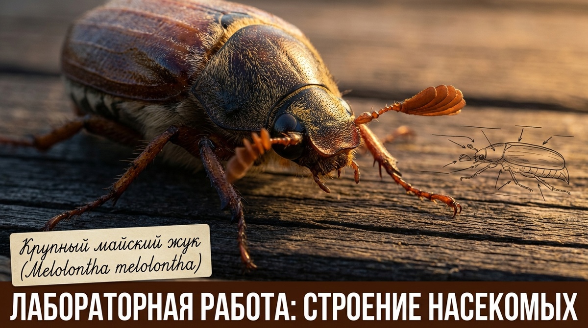 Был момент на первом курсе, когда я три раза перечитывал задание про майского жука и всё равно не понимал, что конкретно нужно описывать. Голова, грудь, брюшко — окей, ну и что дальше? Оказалось, дьявол в деталях. Давай разберём, что именно смотрят в этой лабораторной и почему строение насекомого — это не просто «три части тела». Классика жанра — лабораторная работа по изучению внешнего строения насекомых проводится на примере майского жука. Почему? Он крупный, хитиновый покров плотный, все части хорошо видны без микроскопа. Удобная «модель» для изучения типичных признаков класса. Насекомые — самая многочисленная группа животных на Земле: больше 1 миллиона известных видов. Это не просто факт для галочки — это значит, что строение, которое ты изучаешь у жука, отражает план, «работающий» уже сотни миллионов лет. Первое, что нужно отметить: покров насекомого состоит из хитина. Это плотный, прочный, практически нерастворимый полисахарид. По факту — наружный скелет. Он защищает, поддержив