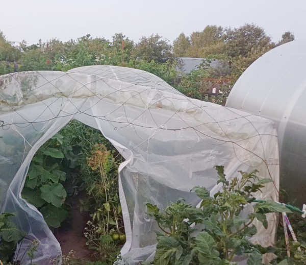 Сама пленка Росток тоже служит дольше положенного ей срока. Я уж и не помню, как давно мы ее купили, но точно раньше, чем семь лет назад. Это у данной пленки гарантированный срок службы такой - семь лет. Она закрывает основную часть теплицы, а боковины мы меняем раз в пару лет. Их я выкраиваю из обычной полиэтиленовой парниковой пленки, пришиваю липучки - получается вход-выход. В общем к