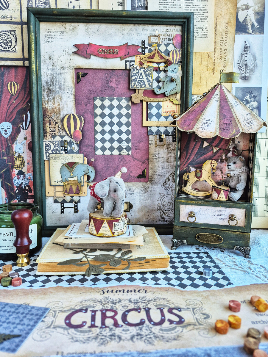 Приветствую друзья, с вами Надя Семашко, и сегодня мы окунемся в чарующую атмосферу старого цирка! Немного ностальгии вдохновленной винтажными афишами и безусловно нашими новинками "Куда уехал цирк" и "Спят усталые игрушки" Эти релизы буквально взбудоражили мое воображение! Я с радостью представляю вам крошечных героев: мишку, слоника, лошадку-качалку и даже настоящий цирковой шатер. Добавив тематическую бумагу и всего пару рамочек из наборов «Слайд-шоу» и "Самое Важное" я погрузилась в настоящую магию цирка, с ощущением чуда из далекого детства, когда глядя на арену с замиранием сердца смотрели на выступление акробатов и дрессированных животных. Интерьерные фоторамки и декоративные аксессуары с милыми теддиками стали не просто игрушками, а центральным украшением книжной полки, осталось только распечатать подходящее фото. Творите с удовольствием!