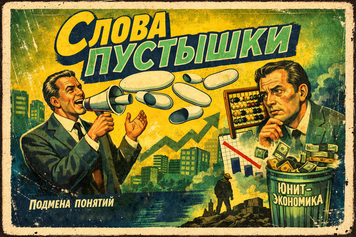 Когда слова перестают описывать бизнес и начинают скрывать его отсутствие. Берём нормальное понятие, вынимаем из него смысл, надуваем пафос — и продаём как «подход». Большая часть бизнес-поля живёт не на точных терминах, а на тиражируемых ярлыках. Сложные процессы упрощаются до модных слов. Люди не просто путают слова. Они системно подменяют реальность теми определениями, которые им удобны. «Эксперты» копируют «экспертов», рынок копирует рынок — в итоге никто уже не помнит исходный смысл. Чем проще и громче термин — тем легче его продать. Никто не покупает «оптимизацию unit-экономики». Все покупают «масштабирование». Следствие: рынок массово обучается неправильным определениям. Формулировка продаёт быстрее, чем смысл. «Масштабирование» звучит как инвестиции. «Рост на 12%» — как скучная реальность. Чем менее проверяемо — тем безопаснее выглядеть «экспертом». Следствие: выбирают слова, которые выглядят дороже, а не точнее. Чем размытее термин — тем сложнее задать вопрос: «Где результат?»