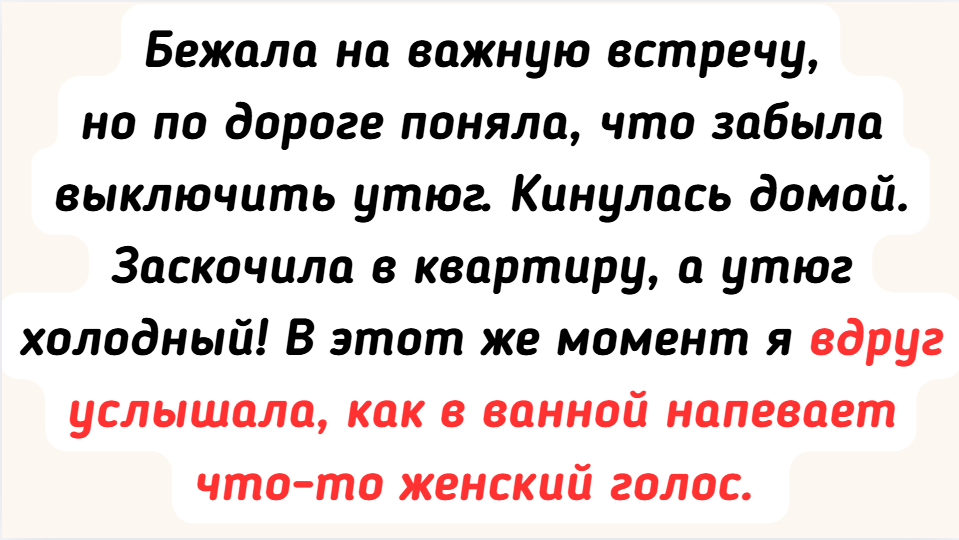 - Бежала на важную встречу, но по дороге поняла, что забыла выключить утюг. Кинулась домой. Заскочила в квартиру, а утюг холодный! В этот же момент я вдруг услышала, как в ванной напевает что-то женский голос. Открыла тихонько дверь, а там свекровь зеркало намывает. Решила нам сюрприз сделать.