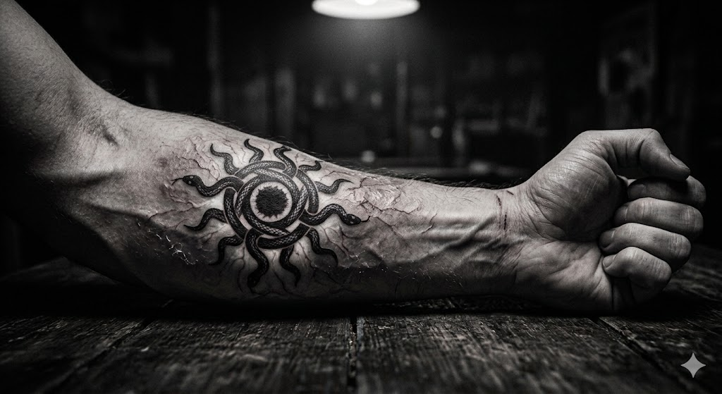 Я уже хотел отмахнуться, но тут мой взгляд зацепился за то, на что он указывал. На предплечье красовалось закрученное спиралью солнце в каком-то первобытном стиле. Похоже на рисунок с древнегреческой вазы, хотя я не мог вспомнить, видел ли я что-то подобное раньше.