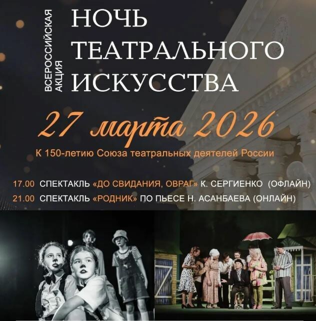 27 марта во Всемирный день театра в стране пройдет всероссийская акция «Ночь театрального искусства». Всероссийская акция «Ночь театрального искусства» приурочена к знаменательной дате — 150-летию Союза театральных деятелей Российской Федерации. В ней примет участие в том числе и Туймазинский драмтеатр. 27 марта в 17.00 юным зрителям и их родителям покажут спектакль русской группы детской театральной студии драмтеатра «До свидания, овраг». Постановка создана по мотивам одноименной повести писателя Константина Сергиенко. Она о дружбе и сострадании. Вход свободный. 6+ Однако, чтобы попасть на спектакль «До свидания, овраг» в рамках акции «Ночь театрального искусства», нужно будет пройти регистрацию на официальном сайте акции: ночьтеатральногоискусства.рф Как это сделать: пройти по ссылке и выбрать Туймазинский драмтеатр в списке участников. Система автоматически перенаправит вас на страницу театра для записи. В 21.00 в рамках акции состоится онлайн-показ спектакля «Родник» по пьесе Нажиб