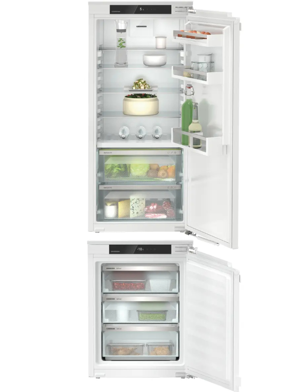 Встраиваемая техника требует особого внимания к деталям: она должна идеально сочетаться с гарнитуром, быть надёжной и предлагать максимум функциональности при компактных размерах. Модель Liebherr IXRF 5625 (состоящая из модулей IRBc 4120 и IFNd 3503) - это двухкамерный side-by-side холодильник, который объединяет немецкое качество, инновационные технологии сохранения свежести и продуманный дизайн. Разберёмся, почему эта модель заслуживает места на вашей кухне. Liebherr IXRF 5625 предназначен для полного встраивания. Жёсткое крепление двери (door-on-door) позволяет навесить фасад, полностью соответствующий кухонному гарнитуру, а переставляемый упор двери даёт возможность адаптировать установку под любую планировку. Модель поддерживает перенавешивание двери, что особенно важно при ограниченном пространстве. Размеры ниш рассчитаны на два стандартных проёма: Корпус выполнен в благородном белом цвете с покрытием, устойчивым к отпечаткам пальцев, что сохраняет опрятный вид даже при активном