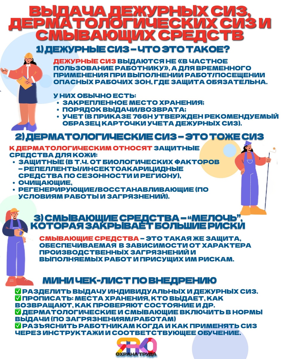 Это три “красных” зоны ответственности работодателя, где чаще всего совершаются ошибки на практике: выдачу дежурных СИЗ путают с обеспечением индивидуальными, дерматологические не считают за СИЗ вообще, а смывающие средства выдают как хозбытовую расходку. Нормативно-правовые требования: ✅ Приказ Минтруда № 766н — разделы VII (дежурные СИЗ) и VIII (дерматологические СИЗ и смывающие средства). ✅ Примеры норм по дерматологическим СИЗ (в т.ч. репелленты/инсектоакарицидные средства) утверждены в приказе по 767н. 1️⃣Дежурные СИЗ — что это такое? Дежурные СИЗ выдаются не «в частное пользование работнику», а для временного применения при выполнении работ/посещении опасных рабочих зон, где защита обязательна. У них обычно есть: закрепленное место хранения; порядок выдачи/возврата; учет (в приказе 766н утвержден рекомендуемый образец карточки учета дежурных СИЗ). Типовый примеры: диэлектрические перчатки и галоши/боты, защитные очки и щитки, фильтрующие СИЗ органов дыхания, защитная каска, нап