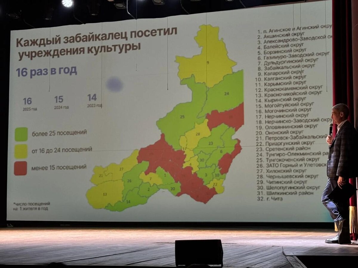 ». Если смотреть на статистику, то по числу посещений культурных мероприятий в расчете на одного жителя край оказался на восьмом месте среди регионов Дальнего Востока. Выше оказался только Приморский край, а такие же показатели — 16 посещений — у Хабаровского края и Амурской области. Данные привели на расширенной Коллегии минкульты Забайкалья. Чаще всего забайкальцы ходят в ДК, библиотеки и музеи. Внутри самого региона картина неравномерная: центральные районы оказались в аутсайдерах, там на одного жителя приходится меньше 15 посещений в год. 🟦 Перейти в MAX