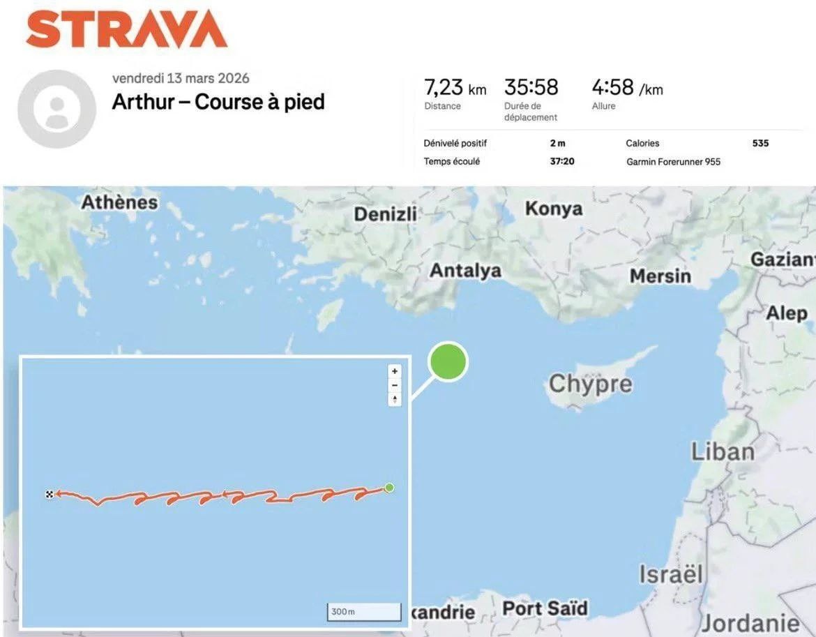 Единственный действующий авианосец ВМС Франции Шарль Де Голль, можно найти на карте пробежок Strava, потому что какой-то чел бегал на палубе и пошарил результат тренировки. @tonrests