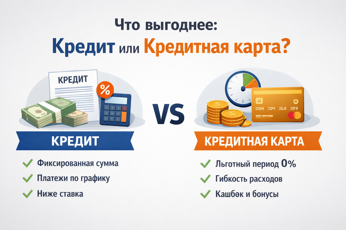 Выбор между потребительским кредитом и кредитной картой — одна из самых частых финансовых дилемм. На первый взгляд оба инструмента дают доступ к заемным деньгам, но на практике они работают по-разному и подходят для разных задач. Разберёмся подробно: где выгоднее, какие подводные камни и как выбрать оптимальный вариант под вашу ситуацию. Это классический займ, который вы получаете одной суммой на руки. Основные характеристики: Вы сразу начинаете платить проценты, даже если не потратили деньги полностью. Это возобновляемый лимит, которым можно пользоваться по мере необходимости. Основные характеристики: Если вернуть деньги в льготный период, проценты могут быть равны нулю. Кредит выигрывает в ситуациях, где важна предсказуемость и крупная сумма. Подходит, если: Кредитная карта — это инструмент для гибкого управления расходами. Подходит, если: Кредит: Переплата составляет примерно 8 000–9 000 ₽. Кредитная карта: Переплата равна 0 ₽. Если не закрыть задолженность по кредитной карте воврем